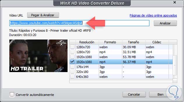 Una de las tareas frecuentes es convertir videos de YouTube a un formato compatible con nuestros celulares, WinX HD Video Converter nos ofrece esta posibilidad usando la opción YouTube URL:
