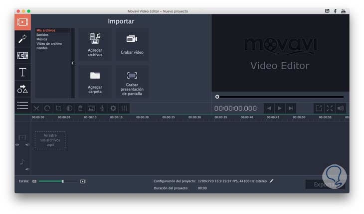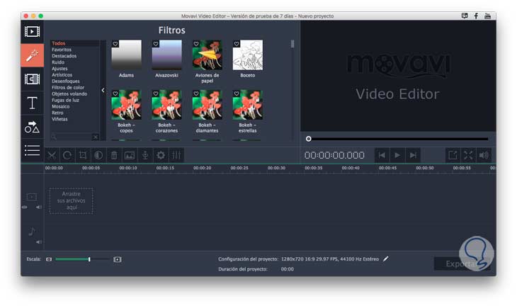 El proceso es similar en macOS Sierra. Una de las principales funcionalidades de Movavi es la posibilidad de agregar efectos a los videos o imágenes desde las opciones Filtros y Transiciones y adicionalmente podemos grabar la pantalla actual tanto en Windows como en macOS Sierra.