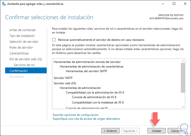 Recordemos que estos servicios nos permiten la compatibilidad con sitios web HTML y ASP.NET. Pulsamos Siguiente y veremos un resumen de la característica a instalar: