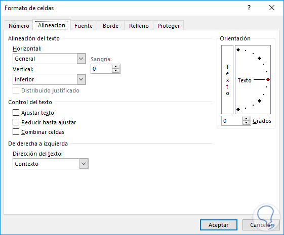 Como podemos ver en la pestaña Alineación, Excel 2016 nos ofrece una amplia gama de opciones para la gestión del proceso de rotación del texto.