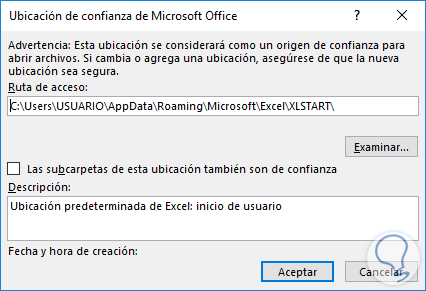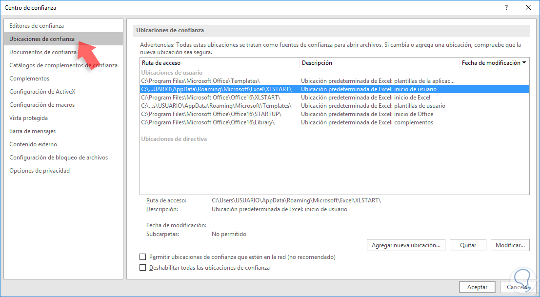 Allí pulsamos la opción Configuración del Centro de confianza y en la ventana desplegada vamos a la línea Ubicaciones de confianza y veremos lo siguiente. Hemos seleccionado la línea Ubicación predeterminada de Excel inicio de usuario y es allí donde Excel 2016 administra los archivos que serán iniciados de forma automática.