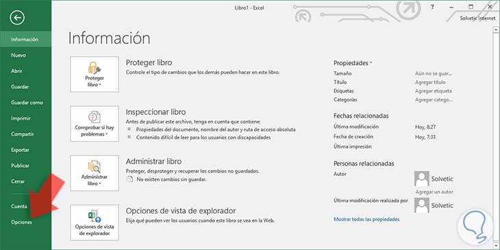 Para iniciar este proceso abrimos una hoja de cálculo de Excel 2016 y vamos a la ficha Archivo y de la lista desplegada seleccionamos la línea Opciones