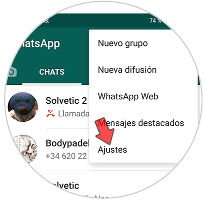 Lo primero que debes hacer es entrar en WhatsApp y pulsar sobre el menú desplegable superior de los tres puntos. Aquí entra en "Ajustes"