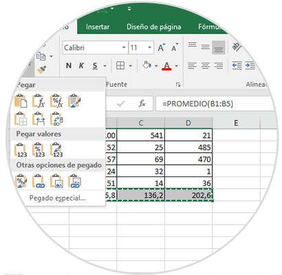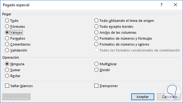 - Valores: Al usar esta opción Excel 2016 pega solamente los resultados de cualquier fórmula en las celdas origen, mas no copia la fórmula.