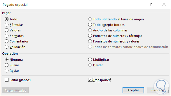 Seleccionamos los datos a trasponer, procedemos a copiarlos, elegimos una celda vacía y vamos a la ficha Pegar y en las opciones desplegadas seleccionamos la opción Pegado especial, veremos la siguiente ventana: