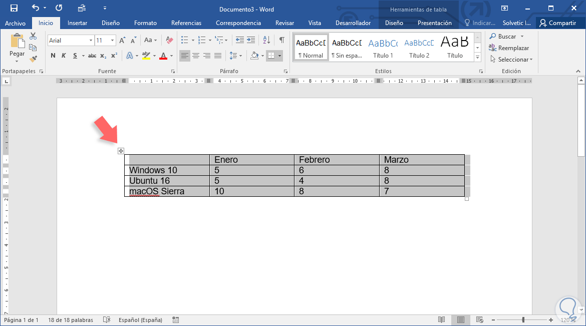 Para iniciar el proceso de transponer los datos de Word 2016 de forma correcta será necesario copiar la tabla en Word 2016 y para esto la seleccionamos desde el icono en la esquina superior izquierda y usamos la combinación de teclas Ctrl + C en Windows o Cmd + C en Mac.