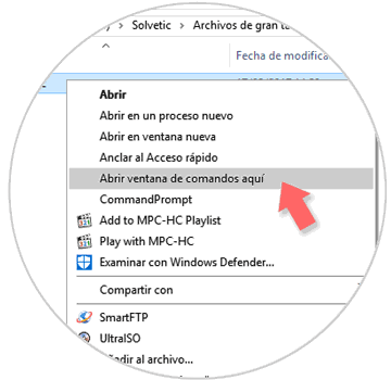 Para eliminar un archivo en Windows desde el símbolo del sistema vamos a la carpeta donde tenemos alojado el archivo y daremos clic derecho manteniendo la tecla Shift presionada y en la lista desplegada seleccionamos la opción Abrir ventana de comandos aquí.