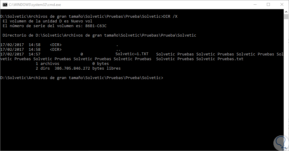 En este ejemplo hemos creado un archivo llamado Solvetic Pruebas, pero con este nombre muchas veces para obtener la extensión permitida. Vemos que el sistema ha creado al inicio del archivo el nombre Solvetic~1.TXT resumiendo el nombre completo del archivo.