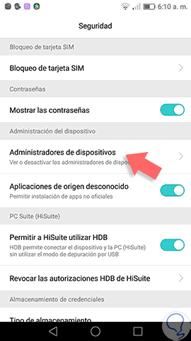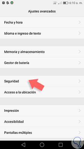 Accedemos a los ajustes del teléfono e ir a la ficha Seguridad, en nuestro caso tenemos un Huawei P9 Lite y allí la ruta es :