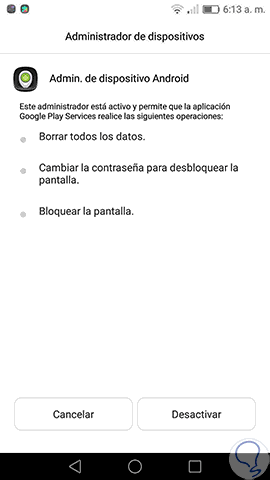 Allí pulsamos en la opción Administradores de dispositivos y en la ventana desplegada pulsamos en la ficha Admin. De dispositivos Android, veremos lo siguiente. En caso de no estar activa pulsamos en el botón Activar para iniciar a usar esta importante utilidad de Android.