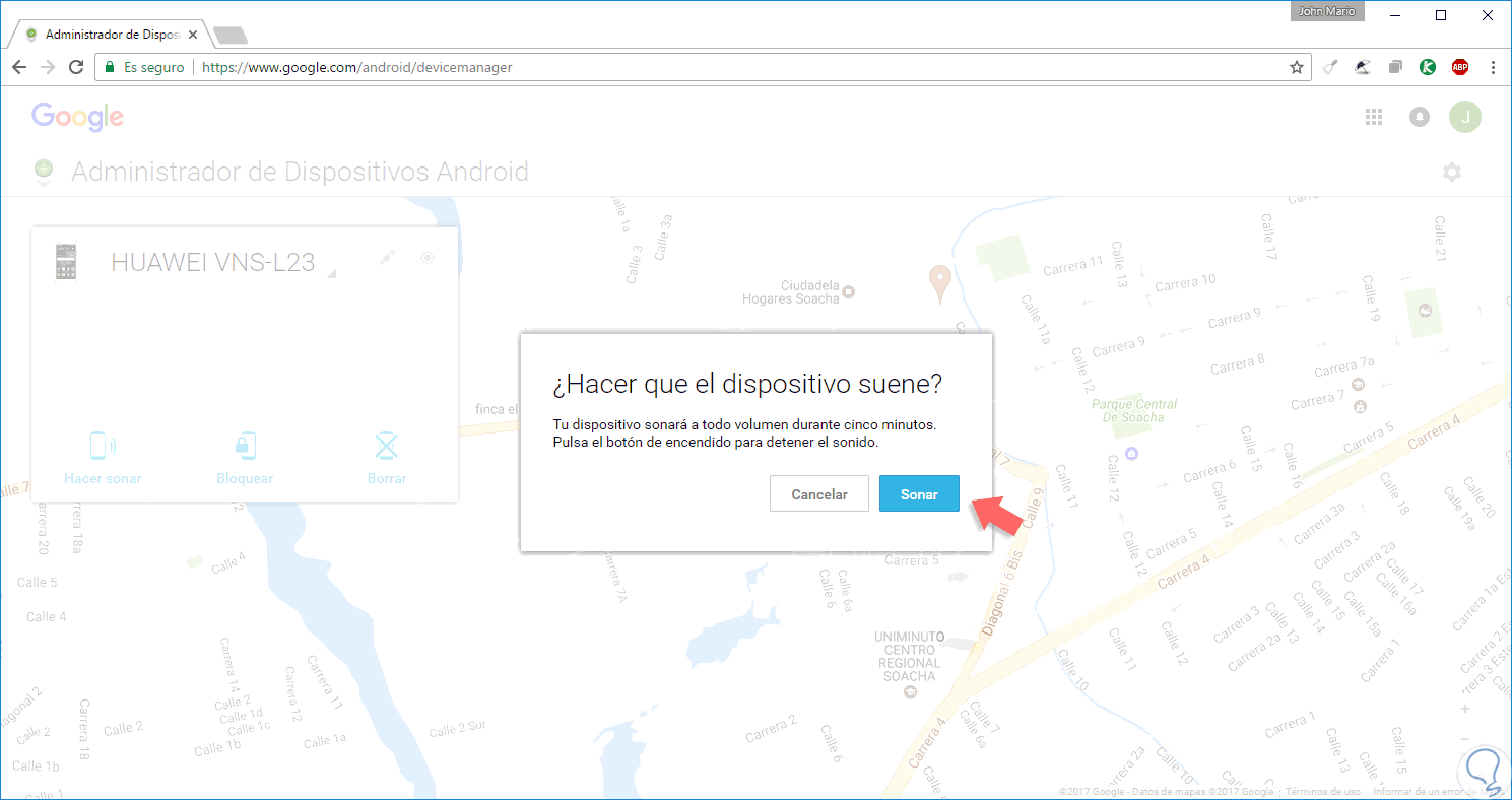 Esta opción es practica si sabemos que el dispositivo se encuentra en el lugar donde estamos, pero no lo encontramos, esto hará que el teléfono suene de manera continua por 5 minutos al máximo volumen sin importar si el equipo está en modo de silencio o vibración.