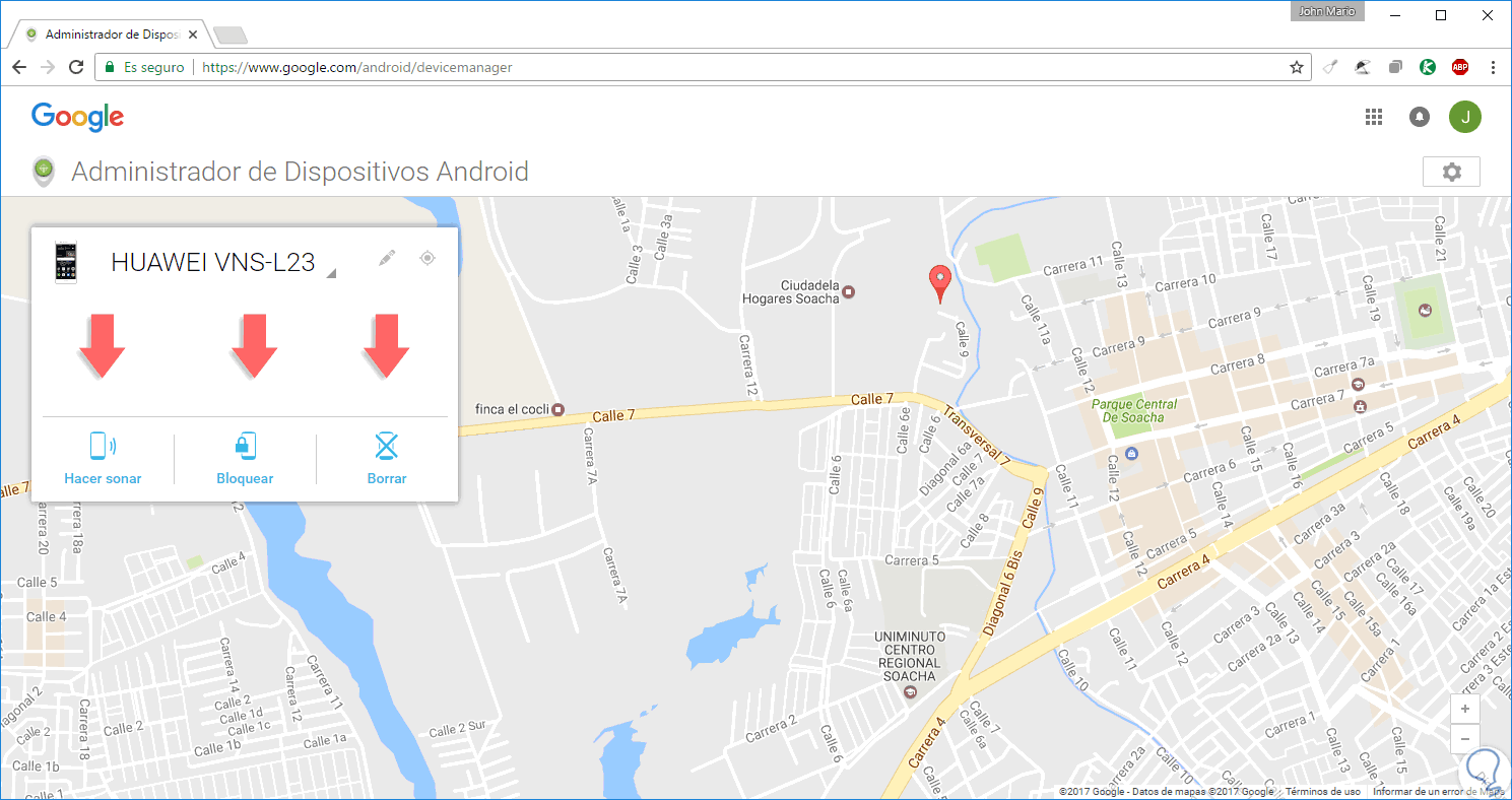 Una vez accedamos, si el equipo esta encendido y cuenta con señal, veremos que la utilidad detecta su ubicación de manera casi precisa. En caso de no contar con señal por la ubicación geográfica del teléfono o porque está apagado el administrador de dispositivos nos informará cuando el teléfono esté disponible.
