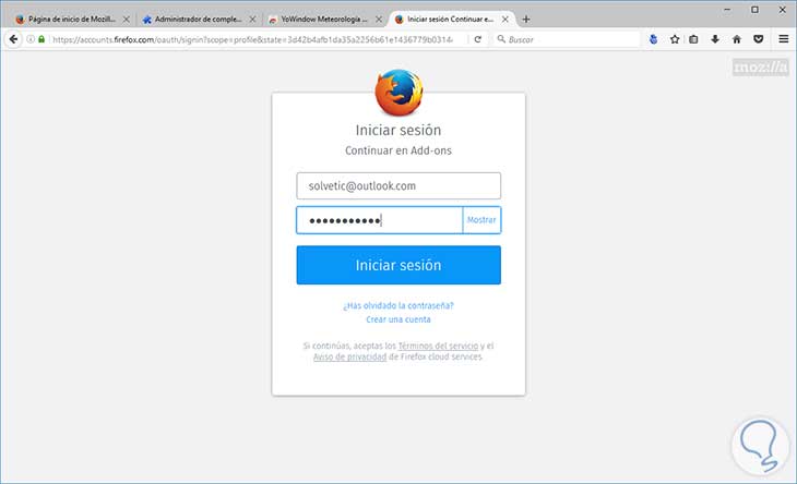 Una vez creada la cuenta iniciaremos sesión para instalar la extensión usando la opción Sign Addon then Install