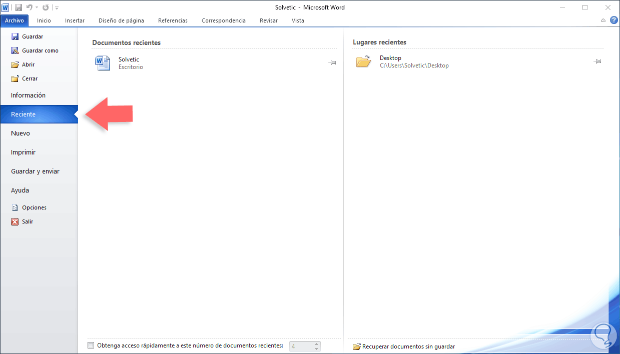 Para este ejemplo usaremos Microsoft Word pero el proceso es similar tanto en Excel como en PowerPoint. Esta opción de auto recuperación está incluida desde Office 2010 y permite que de manera automática Word, Excel o PowerPoint guarden una copia del archivo en el cual estábamos trabajando y ha sido cerrado de forma inesperada. En Office 2010 vamos al menú Archivo y seleccionamos la opción Recientes
