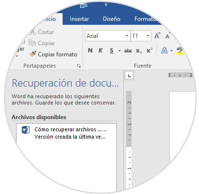 Si usamos Office 2016 al momento de ejecutar la aplicación se desplegarán los documentos que no han sido guardados al costado izquierdo y desde allí podremos recuperarlo pulsando sobre el: