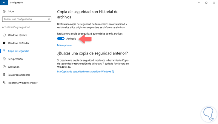 Como una opción adicional tenemos la posibilidad de restaurar el archivo en caso de haber sido eliminado si tenemos activa la opción de Copia de seguridad con Historial de archivos en Windows 10 la cual encontramos en la ruta: