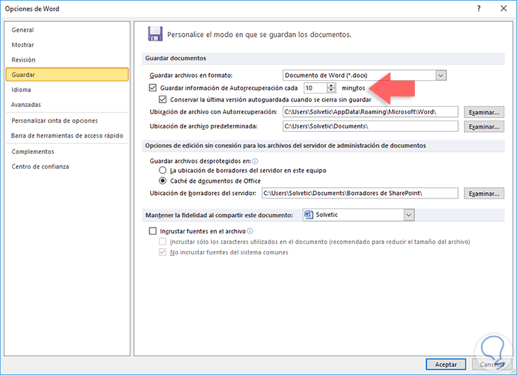 Esta opción nos permite tener una copia de respaldo del archivo siempre disponible para su uso, en algunas versiones encontramos la opción “Crear siempre una copia de seguridad” o en otras versiones, en este ejemplo Word 2010, encontramos alternativas para crear la auto recuperación del archivo o definir un tiempo mínimo para que Office guarde el documento de forma automática: