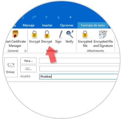Como vemos de esta manera encriptamos nuestros correos electrónicos de manera segura aumentando notablemente los niveles de seguridad en el mismo. Para poder visualizar el correo electrónico vamos a abrimos el correo electrónico, vamos a la pestaña GpgOL y seleccionamos la opción Decrypt.