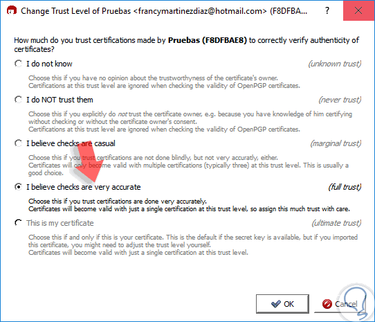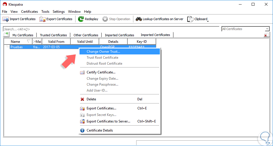Hemos importado de forma correcta la clave pública y el siguiente paso consiste en confiar en dicha clave, para esto damos clic derecho sobre el certificado y seleccionamos la opción Change Owner Trust.