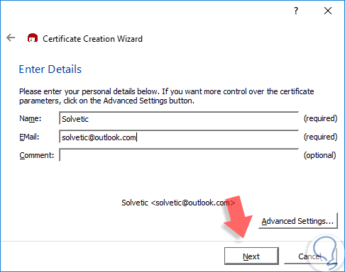 Al seleccionar esta opción se desplegará la siguiente ventana donde debemos ingresar nuestro nombre y dirección de correo electrónico, estas deben ser las que usaremos ya que el par de claves creado estará vinculado a dicha dirección: