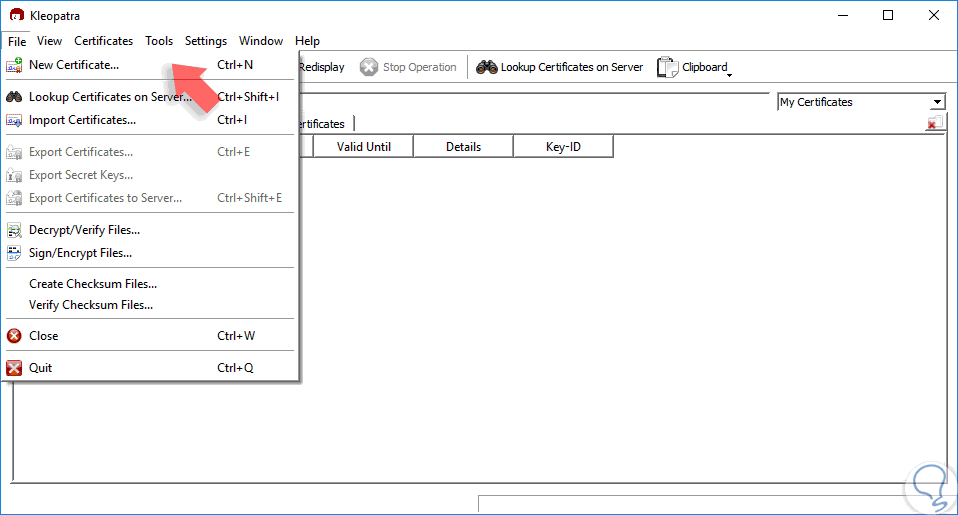 Al ejecutar Kleopatra vamos a la pestaña File y allí elegimos la opción New Certificate. Esta opción la podemos realizar usando la combinación de teclas siguiente.