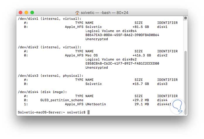 Es importante conocer la ruta exacta que macOS Sierra ha asignado a la memoria USB para de este modo establecerla en UNetbootin. Para conocer la ruta abrimos una terminal en macOS Sierra e ingresamos el comando diskutil list, el resultado será el siguiente: