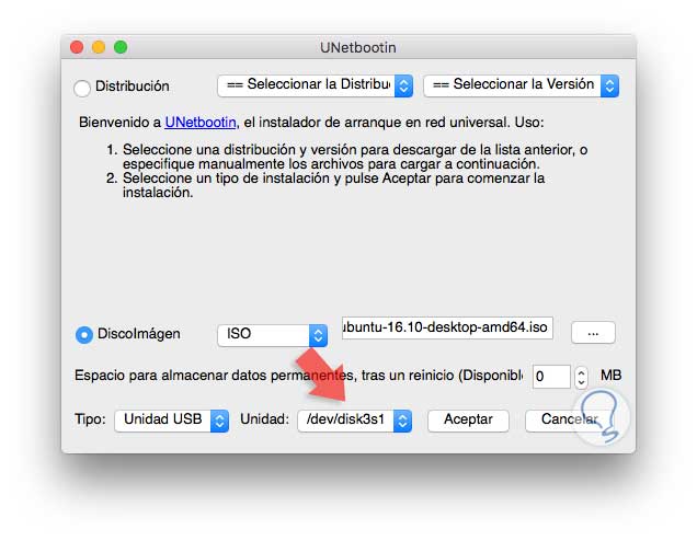 /dev/disk3Para que UNetbootin reconozca el dispositivo USB este debe estar formateado con el sistema de archivos FAT32. Esta ruta será la que seleccionemos en el campo Unidad en la aplicación UNetbootin: