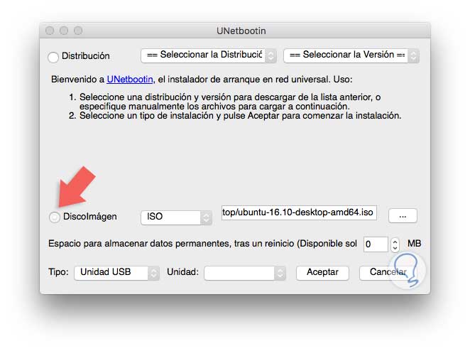Una vez descargada e instalada la herramienta UNetbootin en macOS Sierra procedemos a ejecutarla para comenzar el proceso de creación de la USB booteable. Este será el entorno inicial de UNetbootin. Allí activamos la casilla DiscoImagen y buscamos la imagen ISO, en este caso de Ubuntu 16.10, pulsando en el botón de examinar (…):