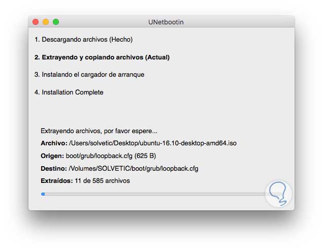 Una vez definida la ruta e imagen ISO pulsamos en el botón Aceptar e iniciara el proceso de creación de la memoria USB booteable en macOS Sierra: