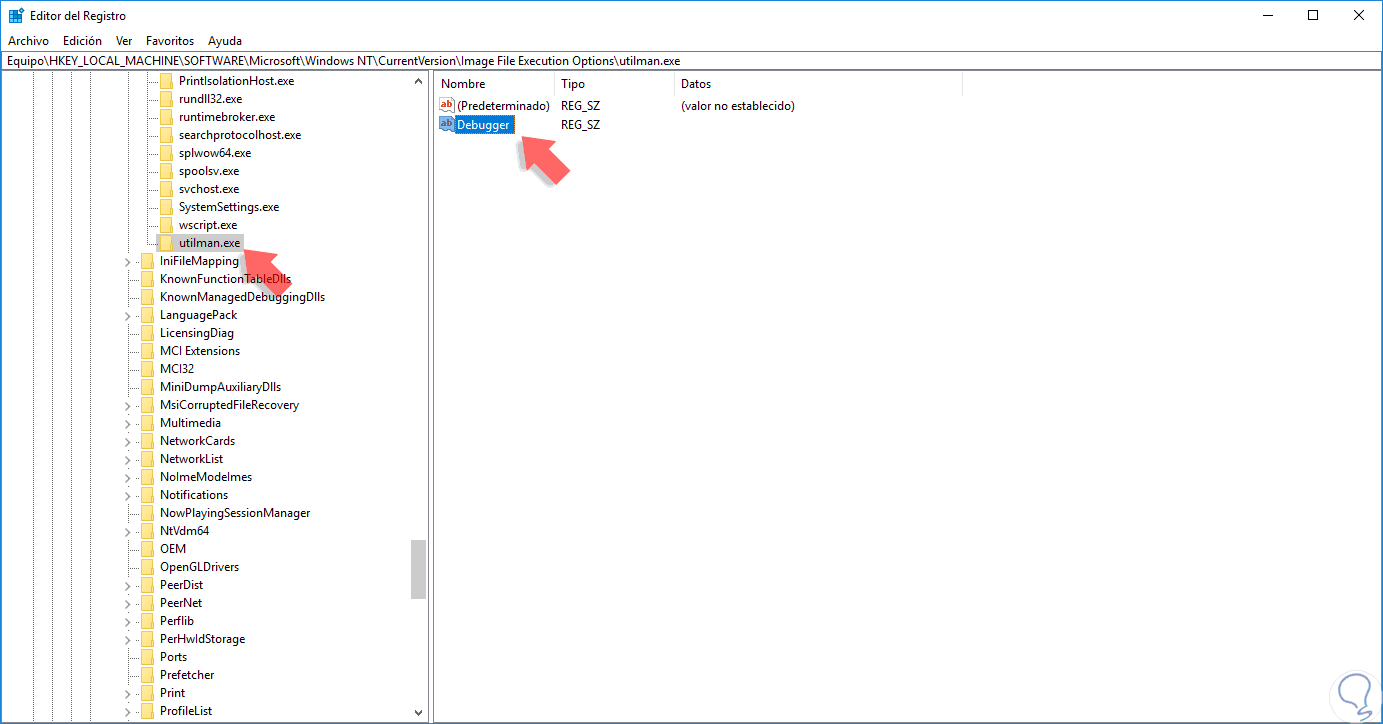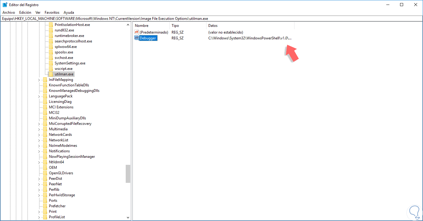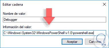 Para esto damos doble clic sobre Debugger, o clic derecho / Modificar, y en el campo Información del valor ingresamos la ruta de Windows PowerShell: