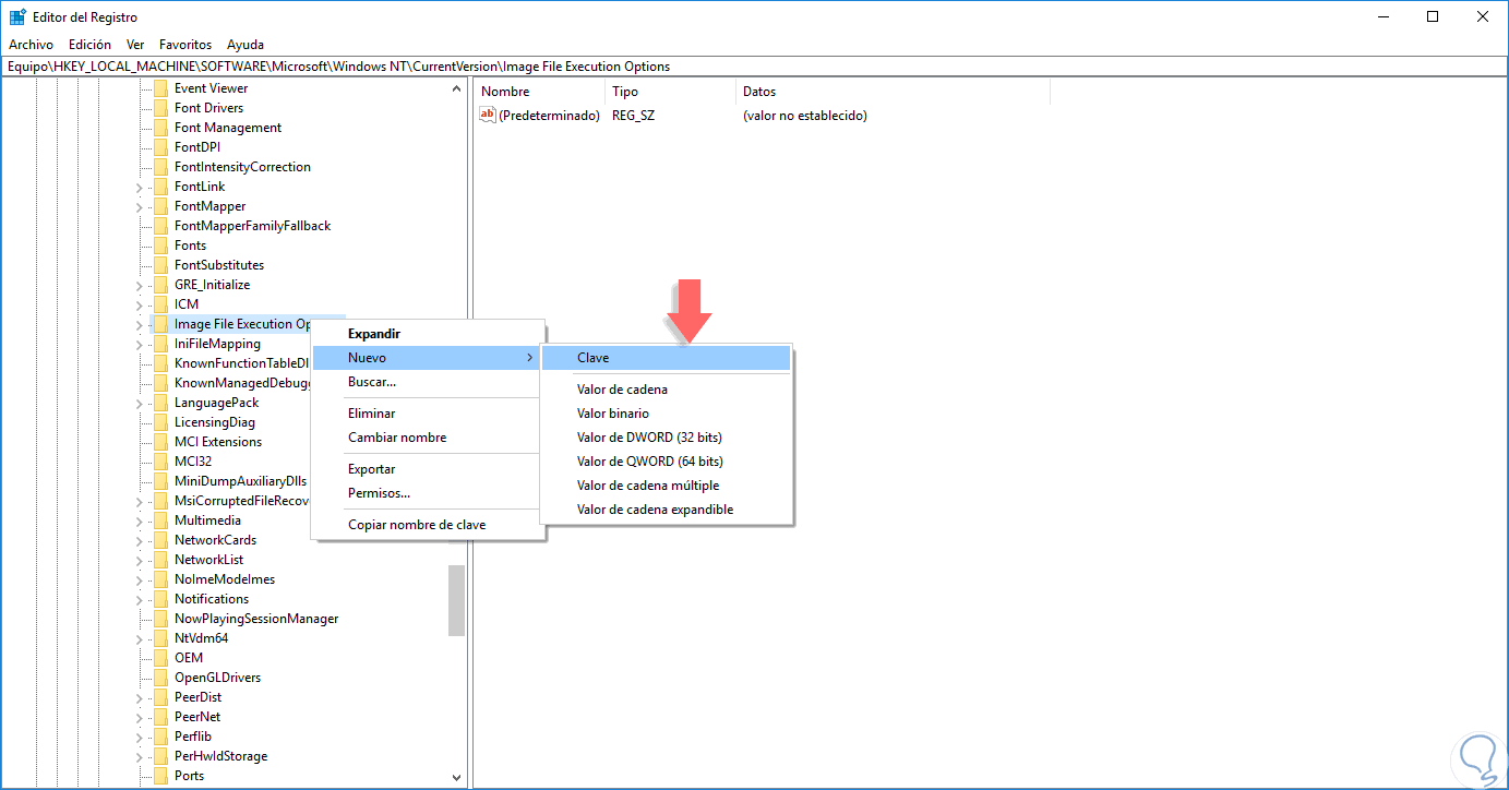 Allí crearemos una nueva clave, para esto damos clic derecho sobre Image File Execution Options y seleccionamos la opción Nuevo / Clave. En la ventana desplegada asignaremos el nombre utilman.exe.