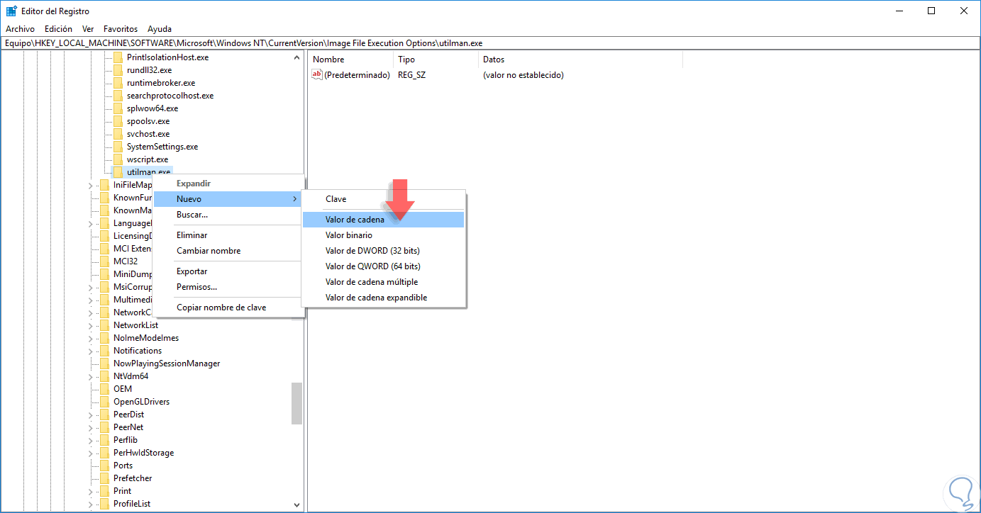 Ahora, sobre utilman.exe daremos clic derecho y seleccionamos la opción Nuevo / Valor de cadena.