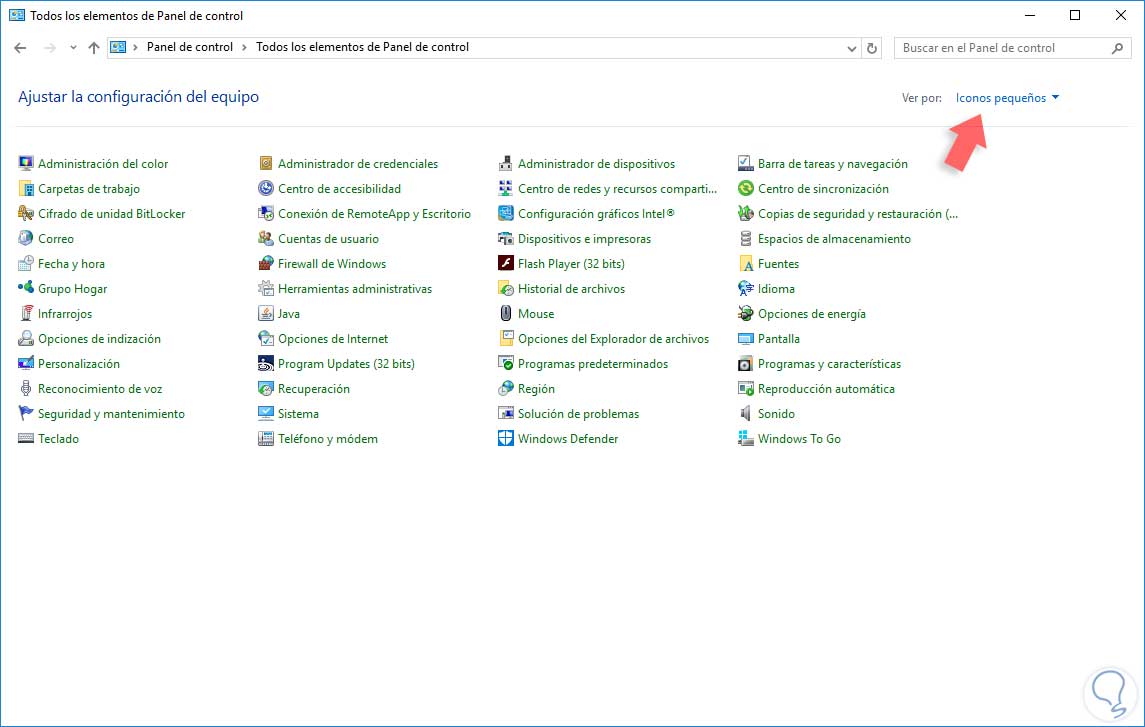 Si por el contrario hemos descargado archivos .cur o .ani el proceso de instalación se ha de realizar de forma manual usando el siguiente proceso: Accedemos al panel de control y seleccionamos la opción Iconos pequeños en la línea Ver por: