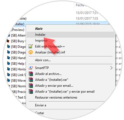 Si el archivo que hemos descargado tiene la extensión .inf simplemente debemos dar clic derecho sobre el icono y seleccionar la opción Instalar: