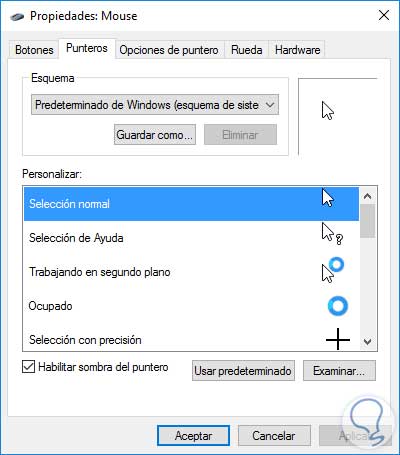 Si deseamos guardar el esquema con el nuevo puntero pulsamos en la opción Guardar como y asignamos el nombre deseado. Si en algún momento deseamos tener nuevamente el cursor predefinido de Windows basta con ir a la opción Puntero y allí elegir la opción Predeterminado de Windows (Esquema de sistema) y así se restaurará el cursor original de Windows 10.