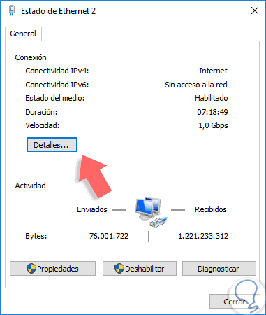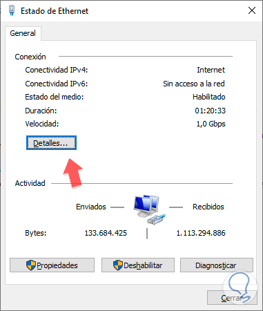 Pulsamos en el botón "Detalles" y en la ventana que será abierta podremos ver toda la información del adaptador de red incluida la dirección MAC: