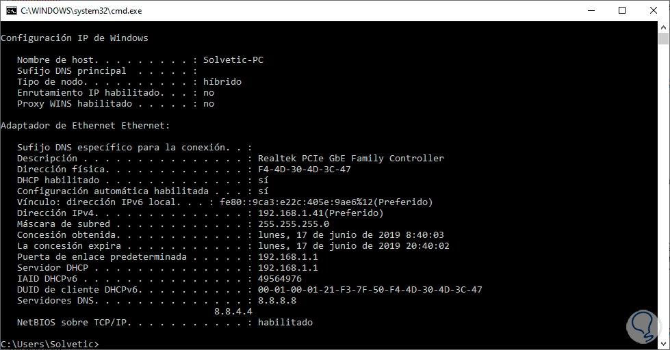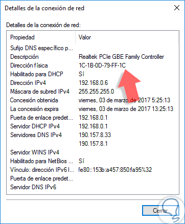A continuación verás que la siguiente ventana incluye información del adaptador donde está la dirección física que buscamos.