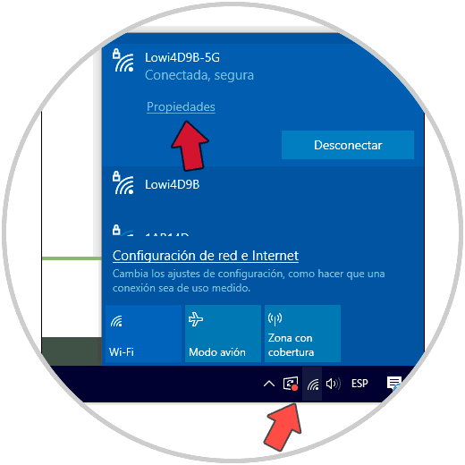 Iremos al icono de WiFi en nuestra barra de tareas y pulsamos sobre él para desplegar las redes. Después sobre la red WiFi a la que estamos conectamos pulsaremos en "Propiedades".