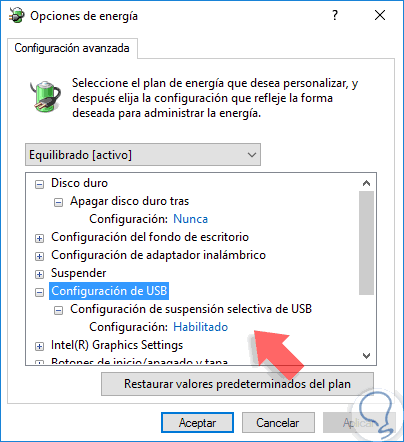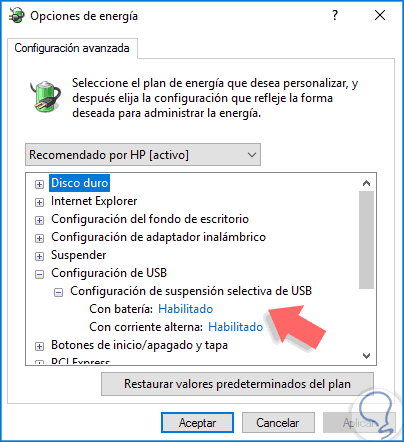 Desplegamos las opciones de dicha selección pulsando sobre el icono + y veremos lo siguiente. Allí simplemente debemos confirmar que la opción Configuración de suspensión selectiva de USB se encuentre habilitada y de este modo disfrutar de esta funcionalidad en Windows 10.