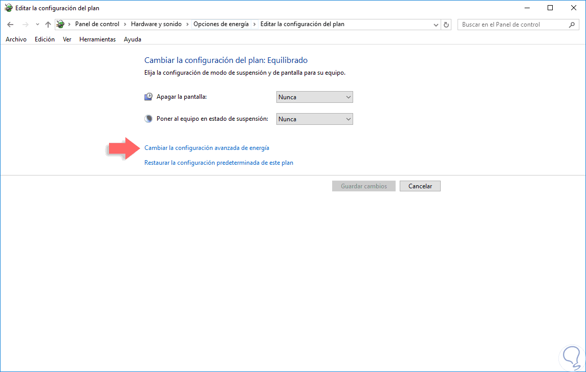 Allí podemos ver el plan de energía seleccionado en el momento, daremos clic sobre la opción Cambiar la configuración del plan ubicada al costado derecho del plan y veremos lo siguiente:
