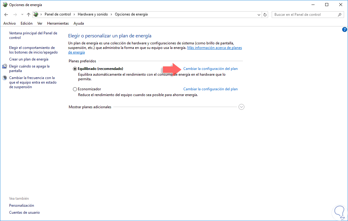 - Accediendo desde el panel de control a la ruta: Panel de control\ Hardware y sonido\ Opciones de energía.