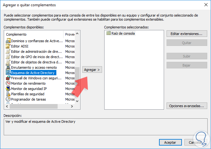 En la ventana abierta ubicamos el complemento llamado "Esquema de Active Directory" y pulsamos en el botón Agregar para adicionar el complemento a la consola: