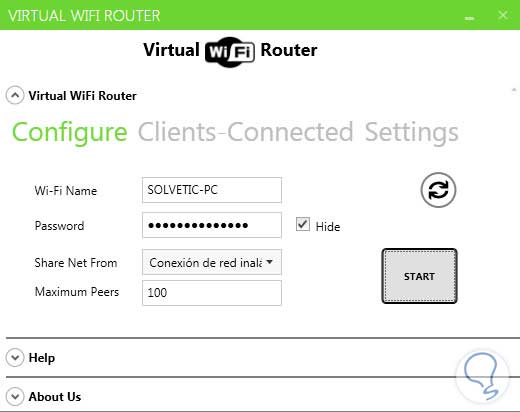 Pulsamos Start y ya estaría funcionando. Ya tendrías el WiFi activo (Debes dejar esta ventana del programa sin cerrar para que siga activo). Ahora desde cualquier equipo o dispositivo aparecerá la nueva WiFi que hemos creado. Nos conectamos con la contraseña que hemos configurado y ya estamos dentro de internet compartido del ordenador con el nuevo WiFi.