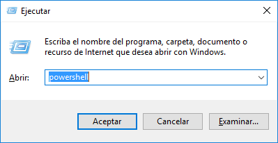 En la ventana desplegada ingresamos PowerShell y pulsamos Aceptar.