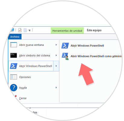 La primera consiste en seleccionar la unidad C, donde está instalado Windows PowerShell, y allí ir al menú Archivo / Abrir Windows PowerShell y seleccionar la opción adecuada.