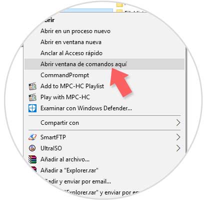 Para este proceso pulsamos la tecla Shift y damos clic derecho sobre la carpeta Explorer y en la lista desplegada seleccionamos la opción Abrir ventana de comandos aquí: