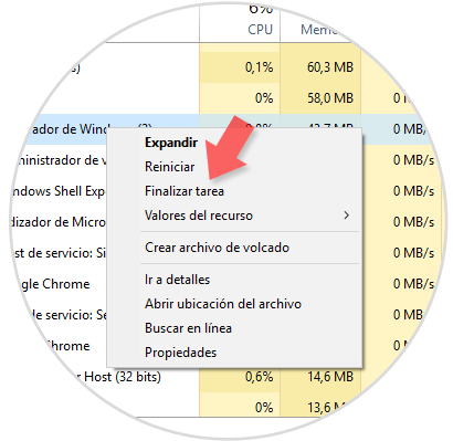 Allí ubicamos el proceso Explorador de Windows, pulsamos clic derecho sobre él y seleccionamos la opción Finalizar tarea