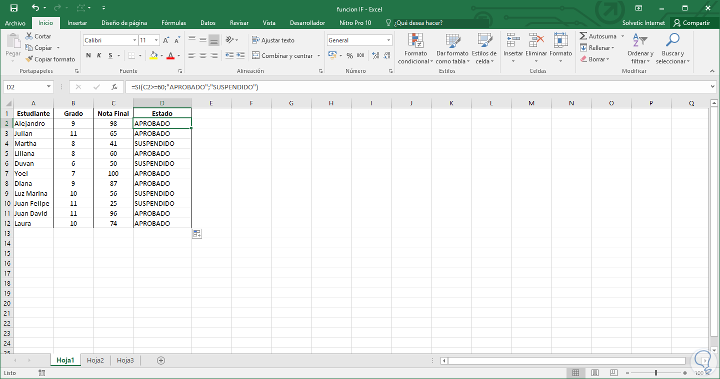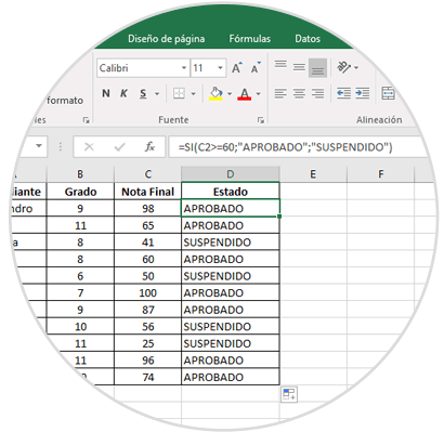 =SI(C2>=60;"APROBADO";"SUSPENDIDO")