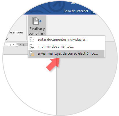 Una vez el cuerpo del mensaje haya sido redactado seleccionamos la opción Finalizar y combinar y en la lista desplegada elegimos Enviar mensajes de correo electrónico: