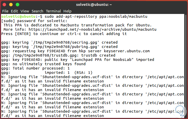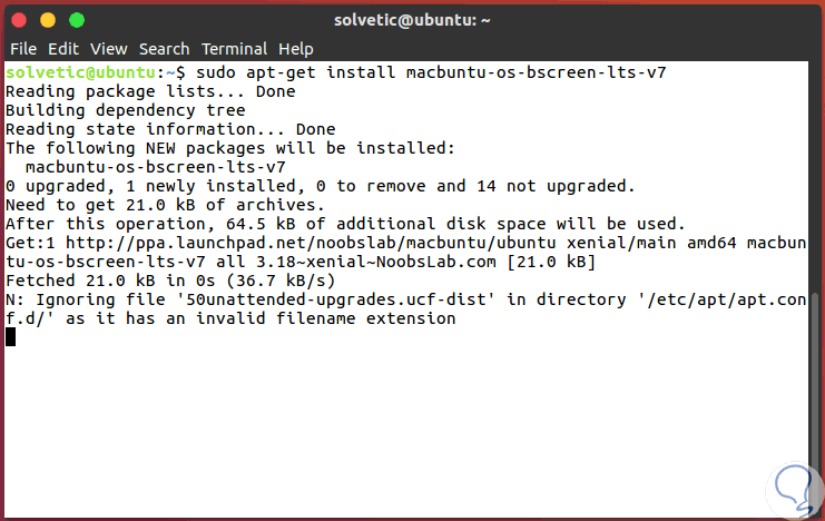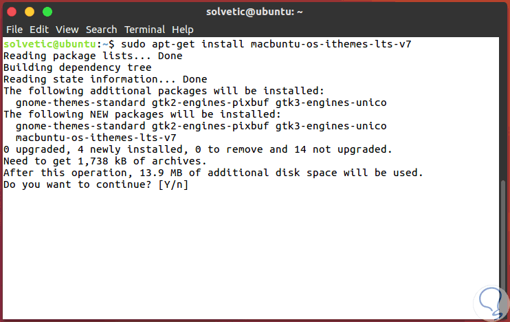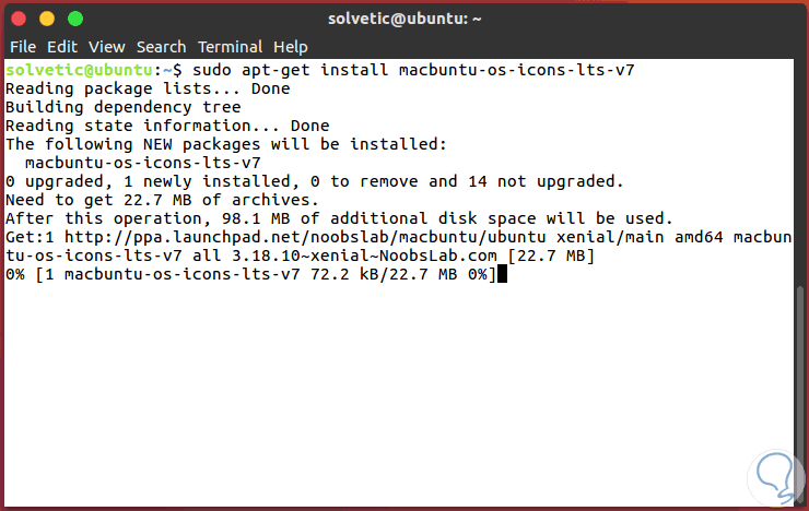 Una vez actualizado el repositorio usaremos la siguiente línea para instalar los iconos de MacBuntu: